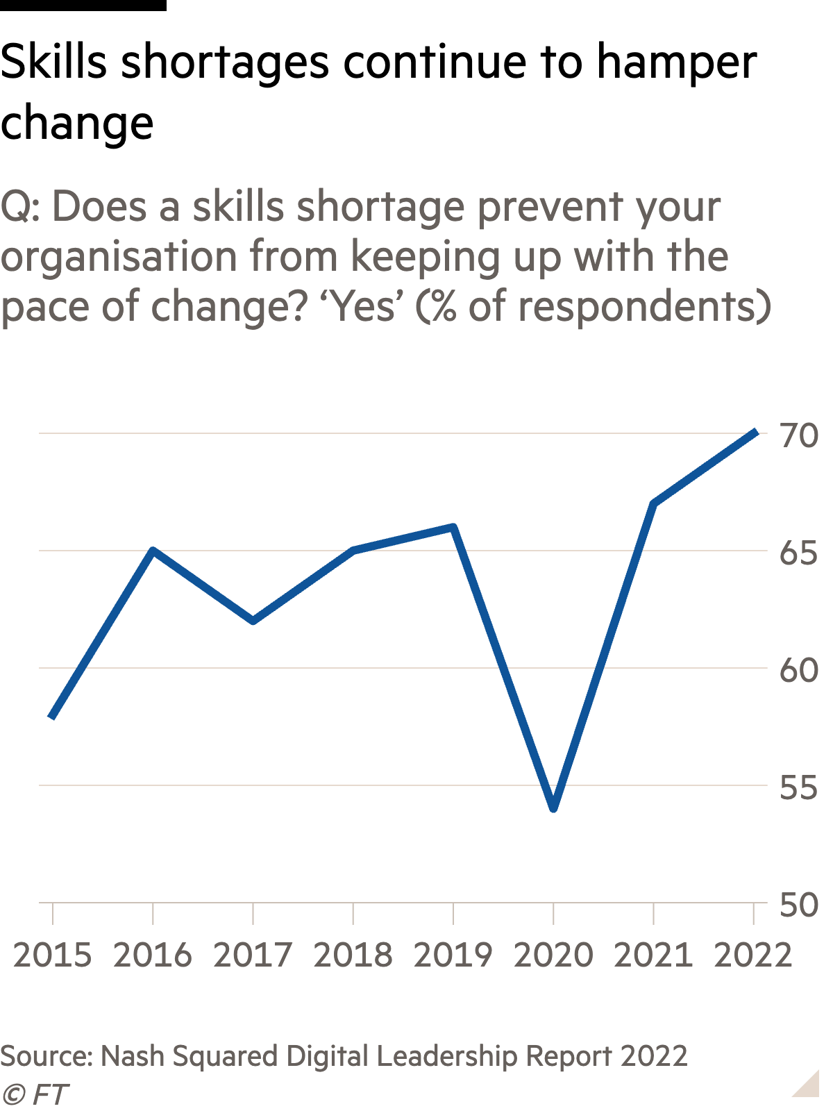 All countries aim to plug similar gaps, so importing specialists will be unsustainable. In 82 countries surveyed by Nash Squared for its Digital Leadership Report 2022, 58 per cent of tech company leaders expected their “skills needs” to increase while 70 per cent said a skills shortage was holding them back, the highest level in 24 years.