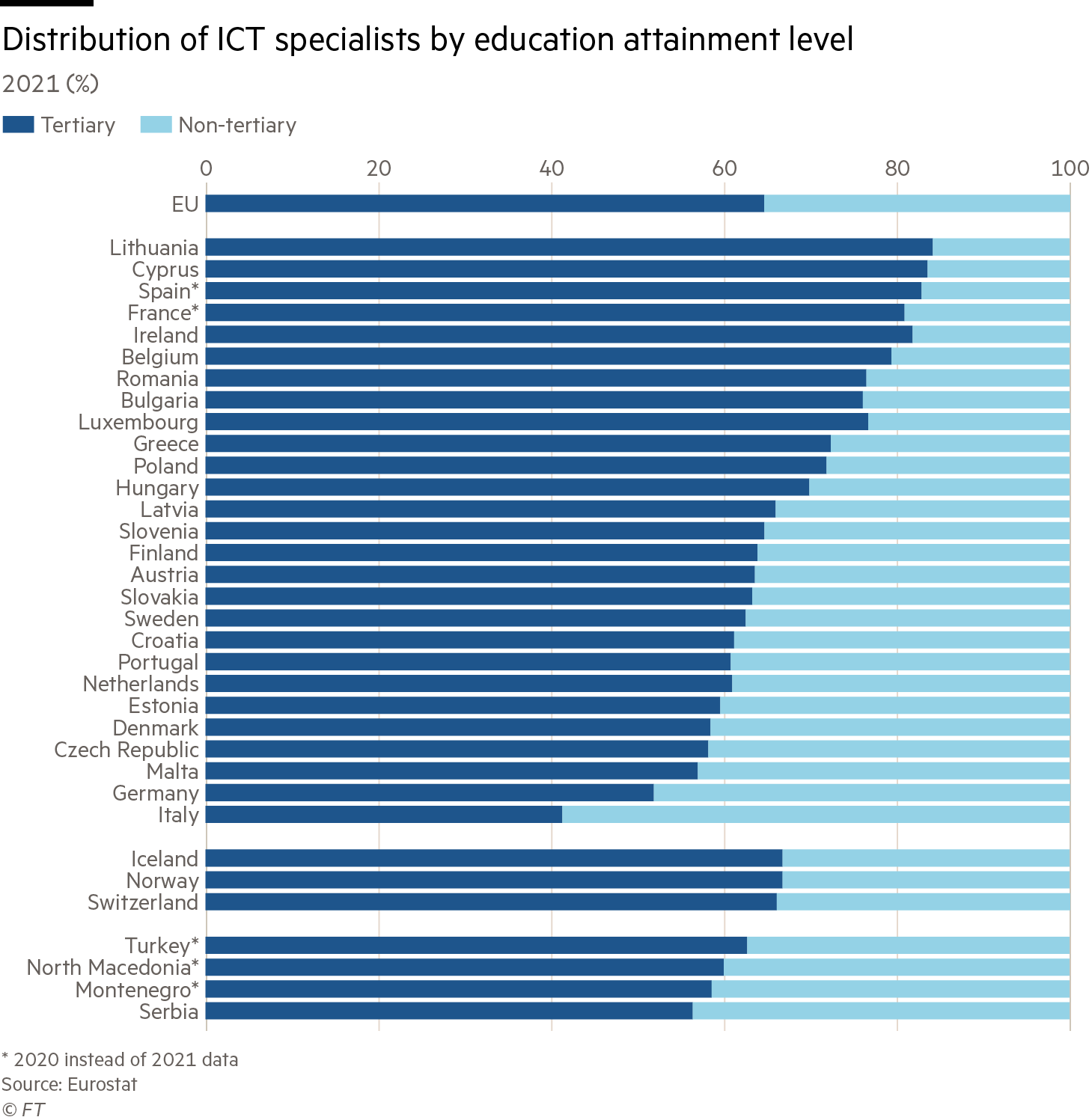 Long-term demand for tech talent is not expected to abate. Based on its digital ambitions the EU alone wants 20mn technology specialists, which compares with the 9mn it had in 2021.